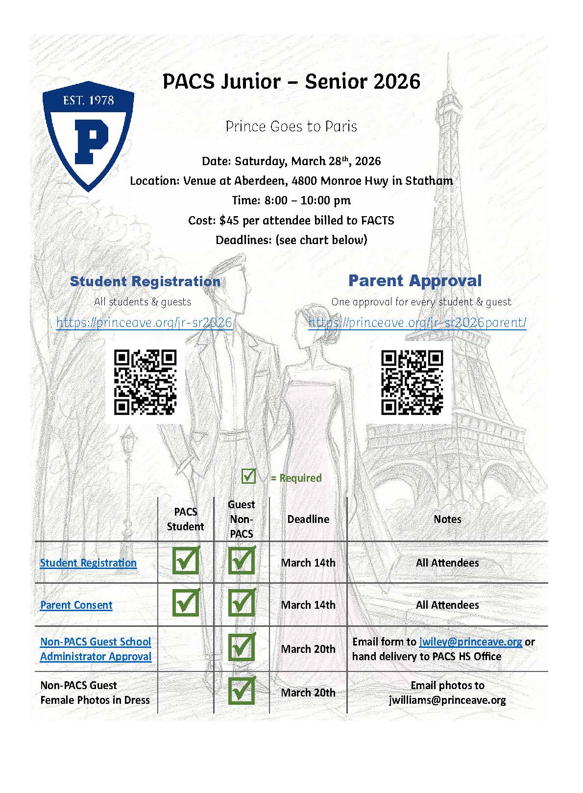 - Female guests must submit a front & back photo of themselves wearing their dress to the Academic Dean at jwilliams@princeave.org.