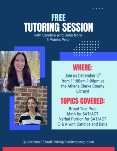 5 Points Prep will be offering FREE test preparation at the Athens Library on Saturday, December 6th, from 11:00 AM to 1:00 PM.